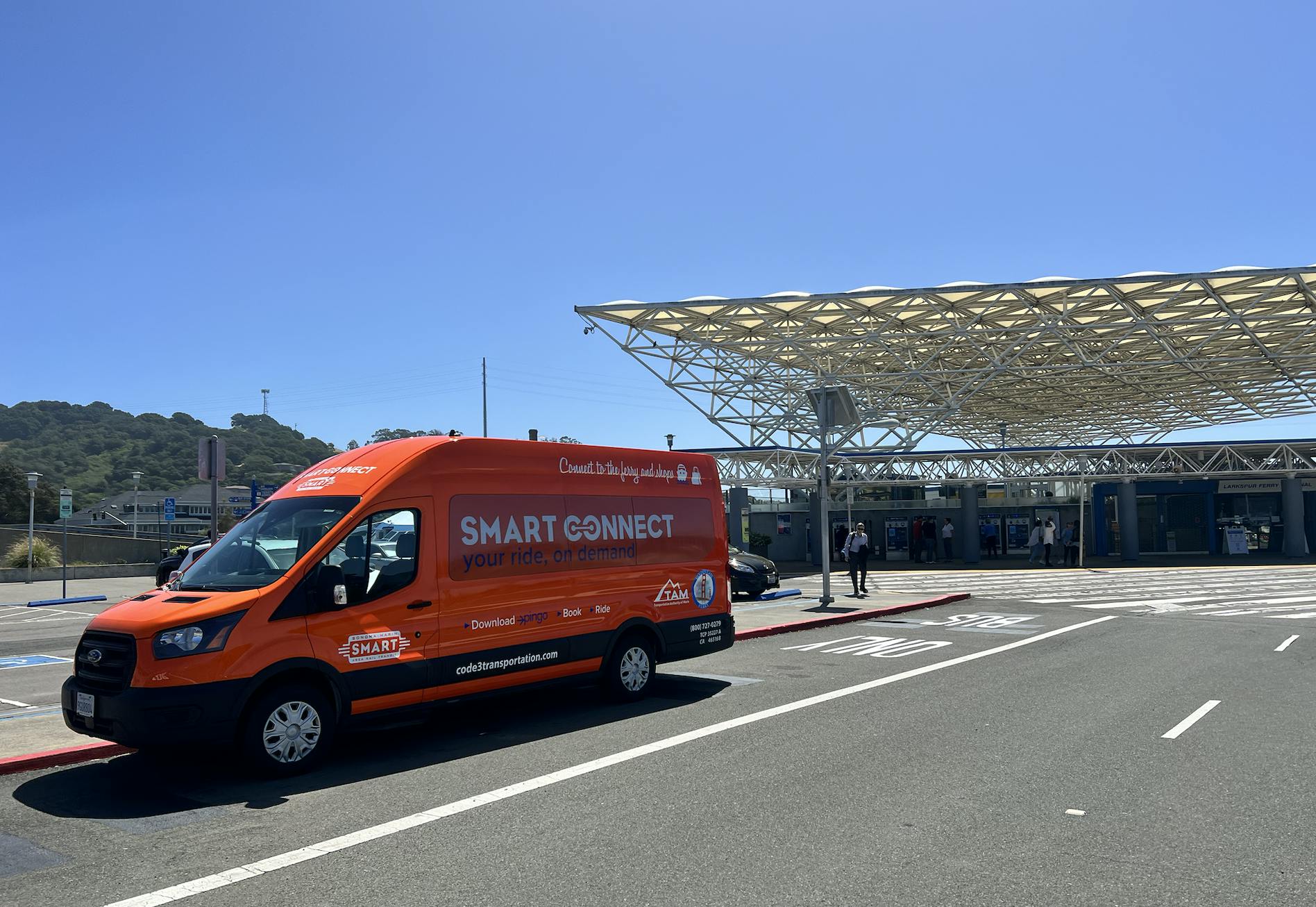 The shuttle is wheelchair-accessible and has luggage space along with other amenities. SMART also operates a Connect shuttle at the Larkspur station.