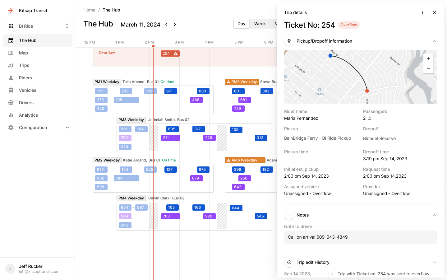 Dispatchers can see when shifts are busy and which trips are shared, which is illustrated by trips stacked on top of each other within a shift. They can also assign drivers to shifts and view or print shift manifests.