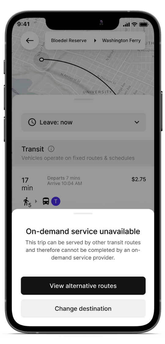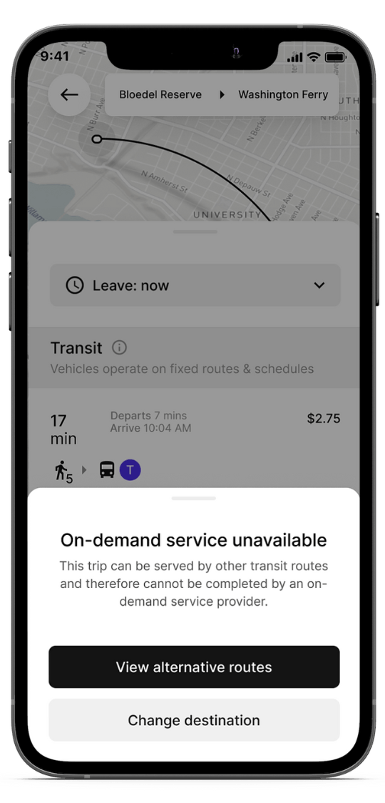 Using Transit Protect™, operators can create zone restrictions within a service area where and/or when on-demand services won’t be available to riders, funneling traffic into well-served fixed routes. These restrictions can be toggled on and off at any time.
